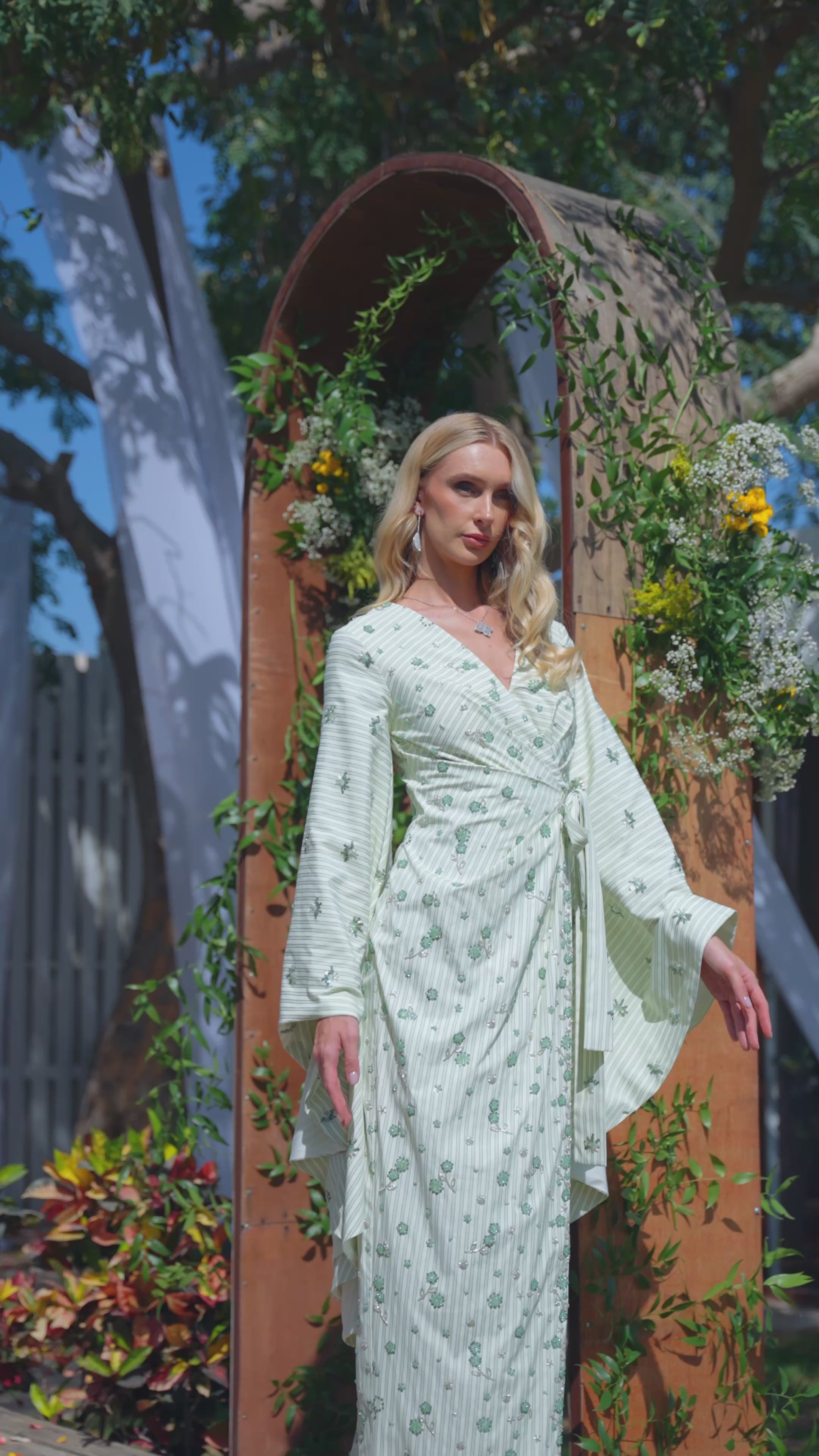 A graceful wrap maxi in sage and white striped cotton silk, unfolding softly with every step. With ruffled edges and a fluid silhouette, she blooms like a rose — gentle, natural, and quietly alive.