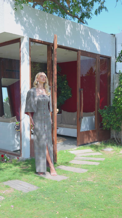 A charcoal houndstooth wool-blend set, pairing a cropped jacket with a sleek column dress for refined structure. With precise lines and quiet confidence, she embodies clarity — considered, composed, and unmistakably intentional.