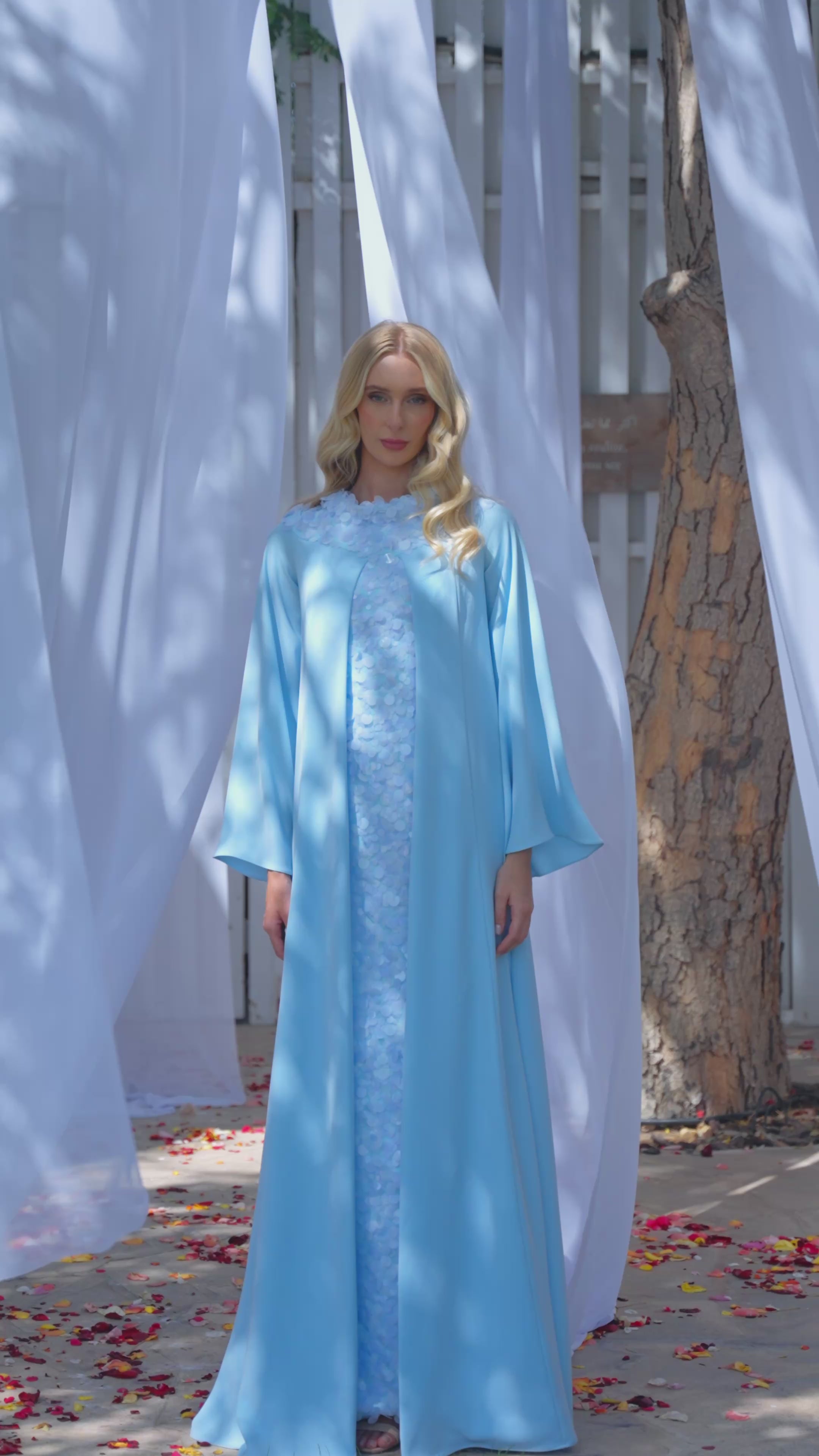 An airy sky-blue open-front A-line abaya in flowing crepe, traced with delicate sequin florals along the centre. With wide sleeves and an effortless drape, she moves without limits — the sky was never her ceiling.